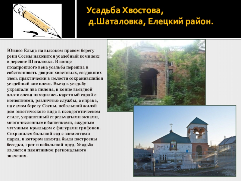 Сосны находится усадебный комплекс в деревне Шаталовка. В конце позапрошлого века усадьба перешла в собственность дворян хвостовых, создавших здесь практически в целости сохранившийся усадебный комплекс. Въезд в усадьбу украшали два пилона, в конце въездной аллеи слева находились каретный сарай с конюшнями, различные службы, а справа, на самом берегу Сосны, небольшой жилой дом экзотического вида в псевдоготическом стиле, украшенный стрельчатыми окнами, многочисленными башенками, ажурным чугунным крыльцом с фигурами грифонов. Сохранился большой сад с элементами парка, в котором некогда были построены беседки, грот и небольшой пруд. Усадьба является памятником регионального значения.