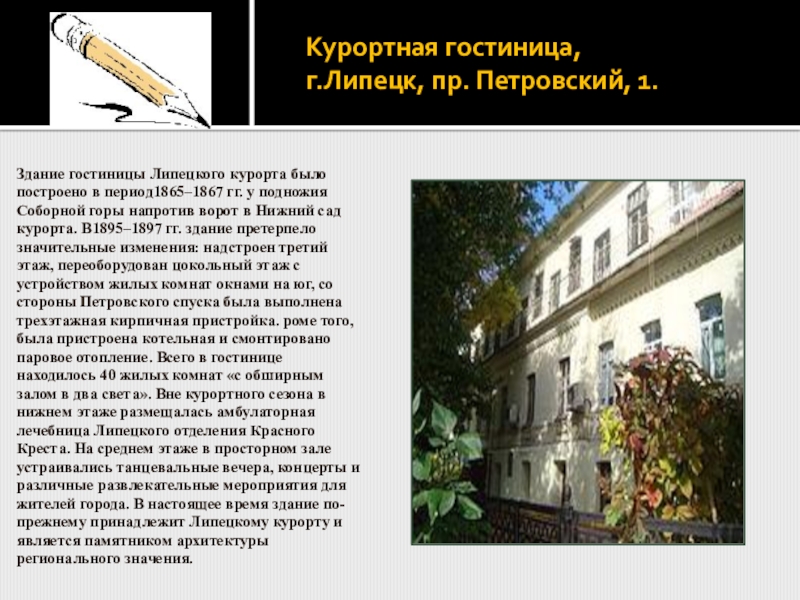построено в период1865–1867 гг. у подножия Соборной горы напротив ворот в Нижний сад курорта. В1895–1897 гг. здание претерпело значительные изменения: надстроен третий этаж, переоборудован цокольный этаж с устройством жилых комнат окнами на юг, со стороны Петровского спуска была выполнена трехэтажная кирпичная пристройка. роме того, была пристроена котельная и смонтировано паровое отопление. Всего в гостинице находилось 40 жилых комнат «с обширным залом в два света». Вне курортного сезона в нижнем этаже размещалась амбулаторная лечебница Липецкого отделения Красного Креста. На среднем этаже в просторном зале устраивались танцевальные вечера, концерты и различные развлекательные мероприятия для жителей города. В настоящее время здание по-прежнему принадлежит Липецкому курорту и является памятником архитектуры регионального значения.