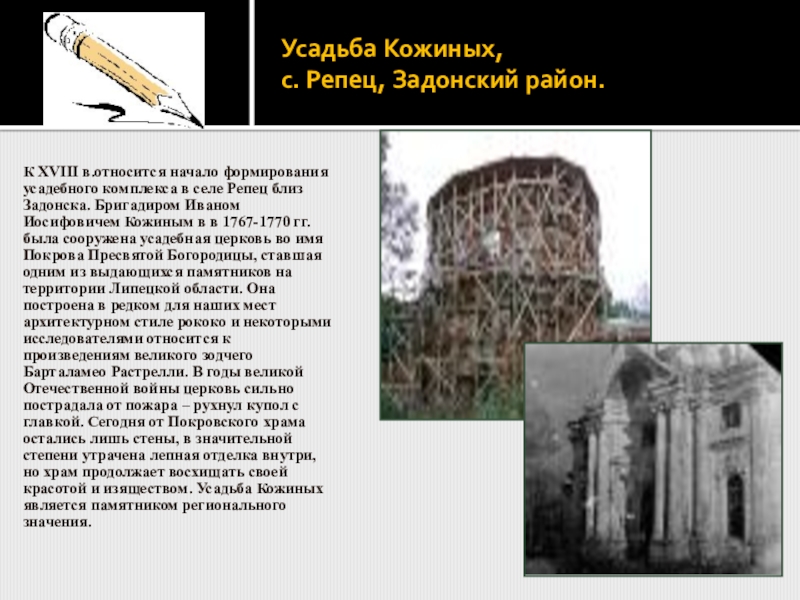 комплекса в селе Репец близ Задонска. Бригадиром Иваном Иосифовичем Кожиным в в 1767-1770 гг. была сооружена усадебная церковь во имя Покрова Пресвятой Богородицы, ставшая одним из выдающихся памятников на территории Липецкой области. Она построена в редком для наших мест архитектурном стиле рококо и некоторыми исследователями относится к произведениям великого зодчего Барталамео Растрелли. В годы великой Отечественной войны церковь сильно пострадала от пожара – рухнул купол с главкой. Сегодня от Покровского храма остались лишь стены, в значительной степени утрачена лепная отделка внутри, но храм продолжает восхищать своей красотой и изяществом. Усадьба Кожиных является памятником регионального значения.