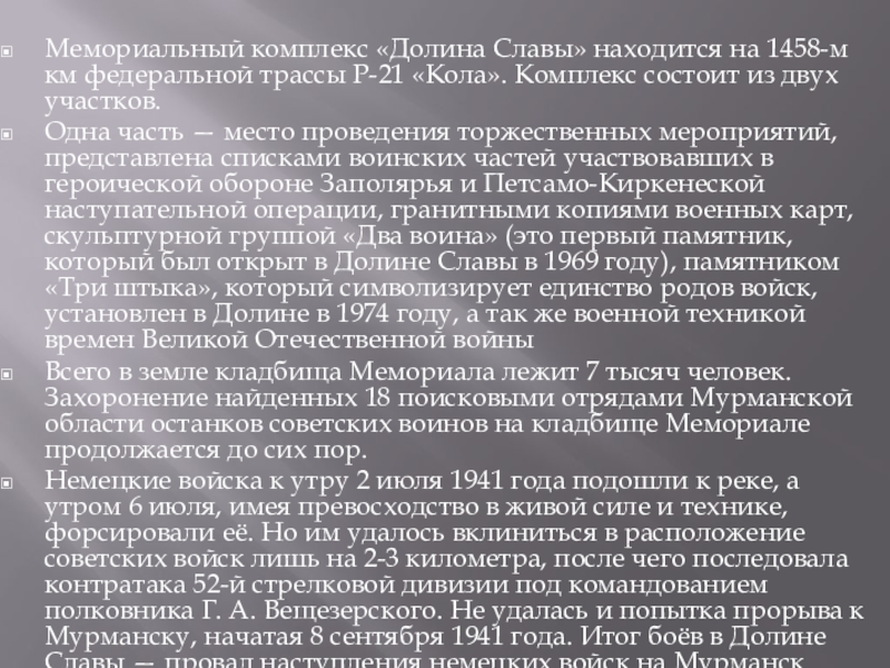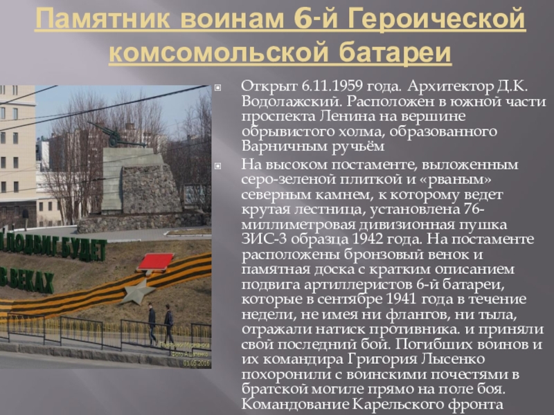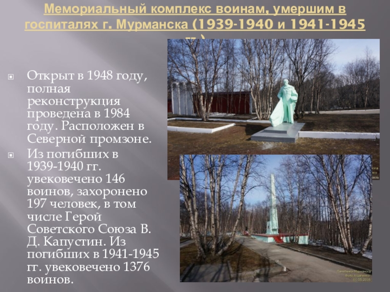 Из погибших в 1939-1940 гг. увековечено 146 воинов, захоронено 197 человек, в том числе Герой Советского Союза В.Д. Капустин. Из погибших в 1941-1945 гг. увековечено 1376 воинов.
