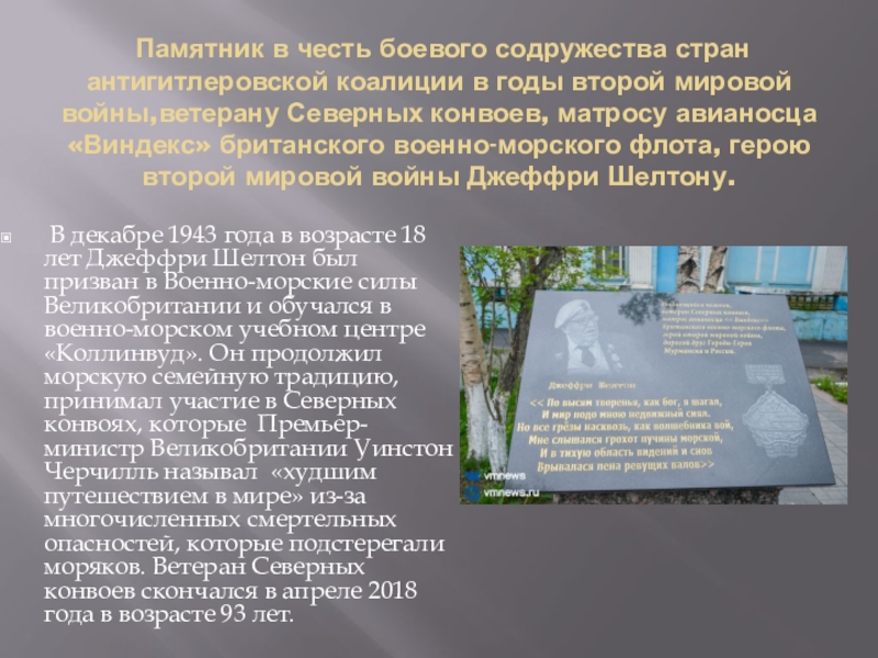 В декабре 1943 года в возрасте 18 лет Джеффри Шелтон был призван в Военно-морские силы Великобритании и обучался в военно-морском учебном центре «Коллинвуд». Он продолжил морскую семейную традицию, принимал участие в Северных конвоях, которые Премьер-министр Великобритании Уинстон Черчилль называл «худшим путешествием в мире» из-за многочисленных смертельных опасностей, которые подстерегали моряков. Ветеран Северных конвоев скончался в апреле 2018 года в возрасте 93 лет.