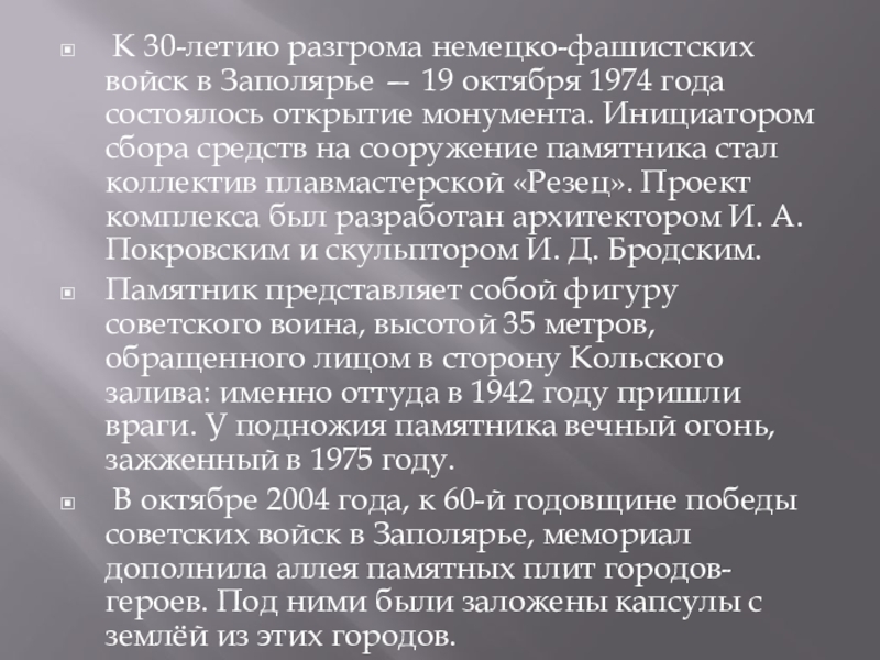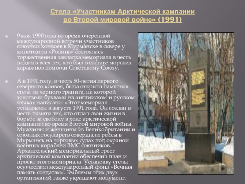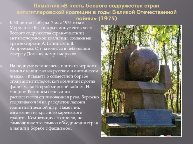 К 30-летию Победы 7 мая 1975 года в Мурманске был открыт монумент в честь боевого содружества стран-участниц антигитлеровской коалиции, созданный архитекторами А. Ганиным и В. Андреевым. Он находится в небольшом сквере у Дома культуры моряков.