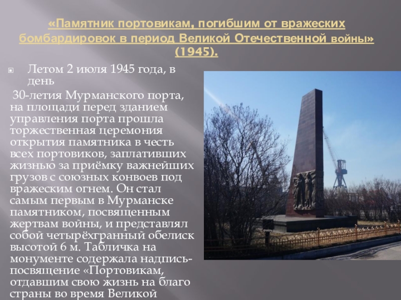 30-летия Мурманского порта, на площади перед зданием управления порта прошла торжественная церемония открытия памятника в честь всех портовиков, заплативших жизнью за приёмку важнейших грузов с союзных конвоев под вражеским огнем. Он стал самым первым в Мурманске памятником, посвященным жертвам войны, и представлял собой четырёхгранный обелиск высотой 6 м. Табличка на монументе содержала надпись-посвящение «Портовикам, отдавшим свою жизнь на благо страны во время Великой Отечественной войны» и полный список погибших (83 человека).