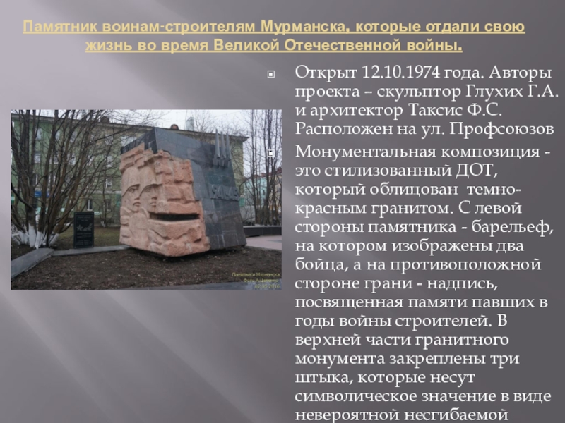 Монументальная композиция - это стилизованный ДОТ, который облицован темно-красным гранитом. С левой стороны памятника - барельеф, на котором изображены два бойца, а на противоположной стороне грани - надпись, посвященная памяти павших в годы войны строителей. В верхней части гранитного монумента закреплены три штыка, которые несут символическое значение в виде невероятной несгибаемой стойкости русского человека к Победе.