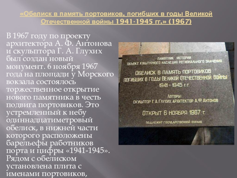 В 1967 году по проекту архитектора А. Ф. Антонова и скульптора Г. А. Глухих был создан новый монумент. 6 ноября 1967 года на площади у Морского вокзала состоялось торжественное открытие нового памятника в честь подвига портовиков. Это устремленный к небу одиннадцатиметровый обелиск, в нижней части которого расположены барельефы работников порта и цифры «1941-1945». Рядом с обелиском установлена плита с именами портовиков, погибших на трудовом посту.