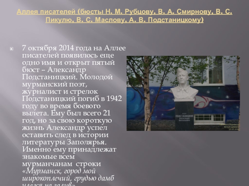 7 октября 2014 года на Аллее писателей появилось еще одно имя и открыт пятый бюст – Александр Подстаницкий. Молодой мурманский поэт, журналист и стрелок Подстаницкий погиб в 1942 году во время боевого вылета. Ему был всего 21 год, но за свою короткую жизнь Александр успел оставить след в истории литературы Заполярья. Именно ему принадлежат знакомые всем мурманчанам строки«Мурманск, город мой широкоплечий, грудью дамб улегся на залив»