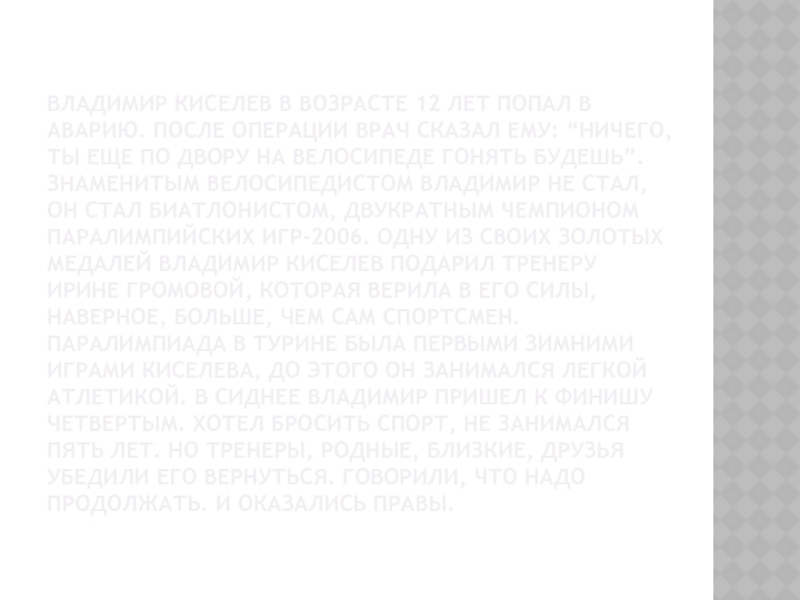 врач сказал ему: “Ничего, ты еще по двору на велосипеде гонять будешь”. Знаменитым велосипедистом Владимир не стал, он стал биатлонистом, двукратным чемпионом Паралимпийских игр-2006. Одну из своих золотых медалей Владимир Киселев подарил тренеру Ирине Громовой, которая верила в его силы, наверное, больше, чем сам спортсмен. Паралимпиада в Турине была первыми зимними Играми Киселева, до этого он занимался легкой атлетикой. В Сиднее Владимир пришел к финишу четвертым. Хотел бросить спорт, не занимался пять лет. Но тренеры, родные, близкие, друзья убедили его вернуться. Говорили, что надо продолжать. И оказались правы.