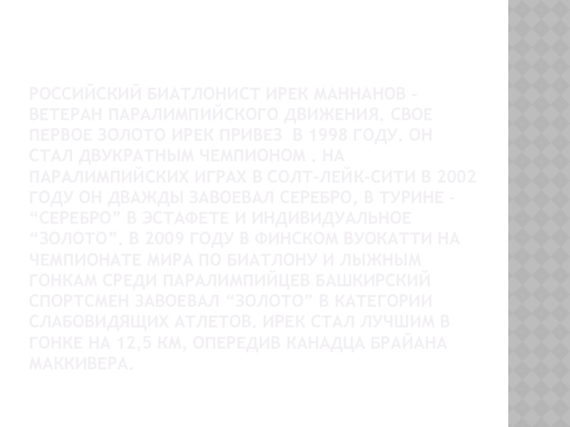 Слайд 15Российский биатлонист Ирек Маннанов – ветеран паралимпийского движения. Свое первое золото
