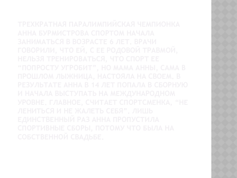 Слайд 7Трехкратная паралимпийская чемпионка Анна Бурмистрова спортом начала заниматься в возрасте 6