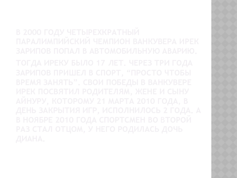 автомобильную аварию. Тогда Иреку было 17 лет. Через три года Зарипов пришел в спорт, “просто чтобы время занять”. Свои победы в Ванкувере Ирек посвятил родителям, жене и сыну Айнуру, которому 21 марта 2010 года, в день закрытия Игр, исполнилось 2 года. А в ноябре 2010 года спортсмен во второй раз стал отцом, у него родилась дочь Диана.