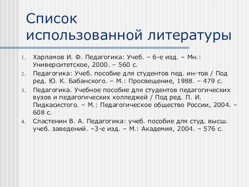 Харламов И. Ф. Педагогика: Учеб. – 6-е изд. – Мн.: