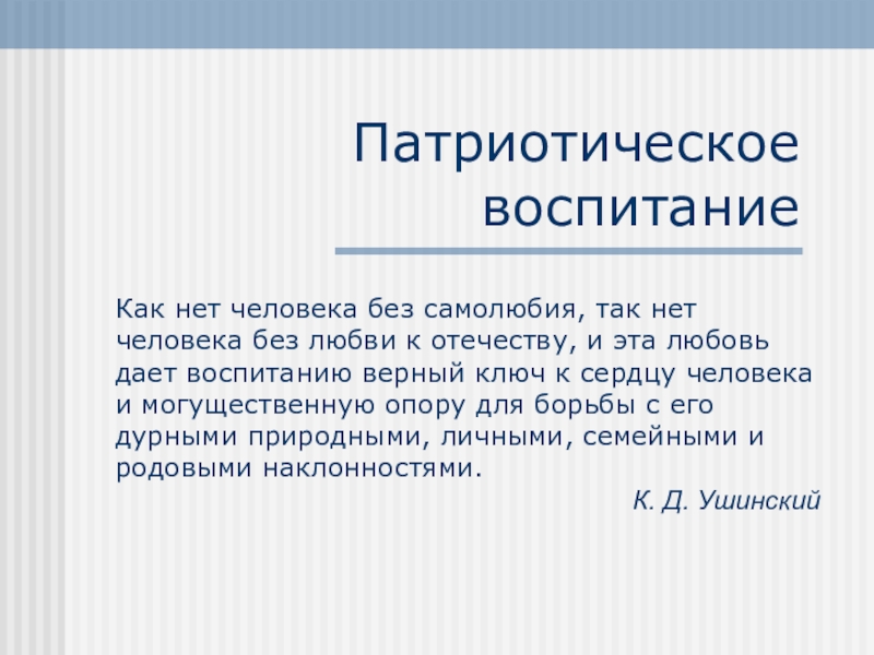 к отечеству, и эта любовь дает воспитанию верный ключ к сердцу человека и могущественную опору для борьбы с его дурными природными, личными, семейными и родовыми наклонностями.
