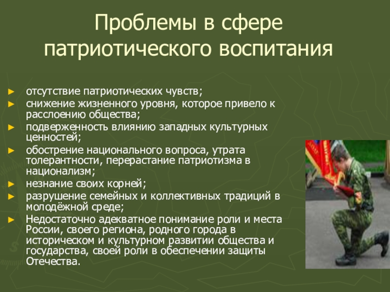 Недостаточно адекватное понимание роли и места России, своего региона, родного города в историческом и культурном развитии общества и государства, своей роли в обеспечении защиты Отечества.