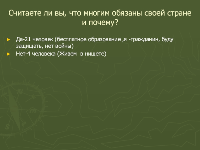 Слайд 13Считаете ли вы, что многим обязаны своей стране и почему?