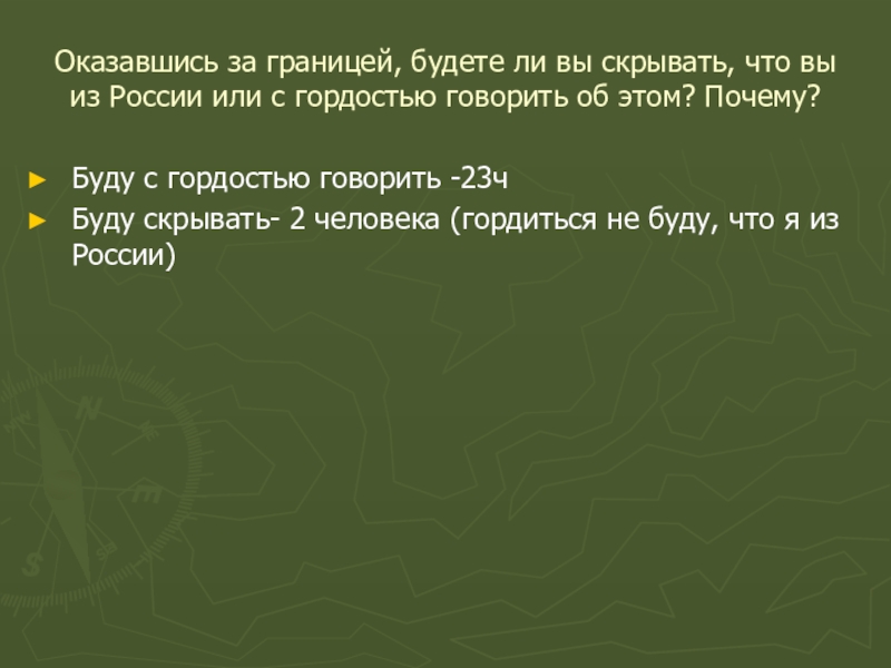 Слайд 14Оказавшись за границей, будете ли вы скрывать, что вы из России