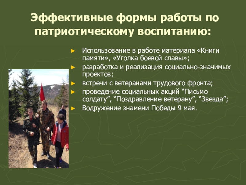 Слайд 9 Эффективные формы работы по патриотическому воспитанию: