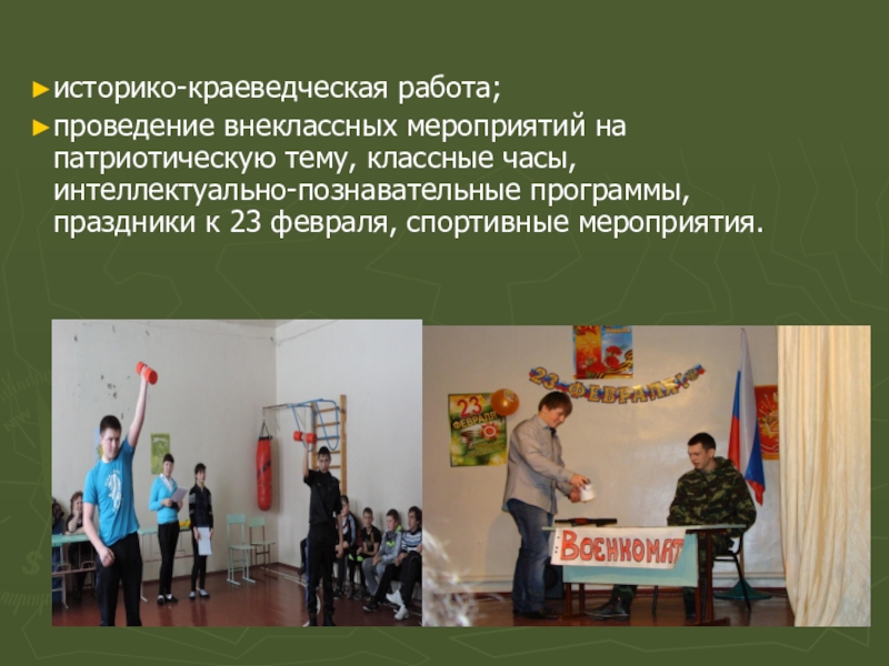 проведение внеклассных мероприятий на патриотическую тему, классные часы, интеллектуально-познавательные программы,
