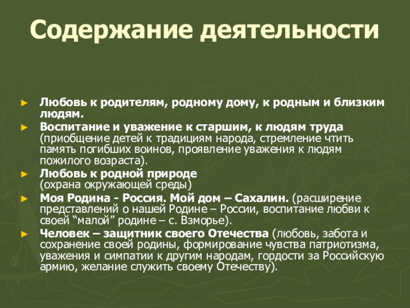 Человек – защитник своего Отечества (любовь, забота и сохранение своей родины, формирование чувства патриотизма, уважения и симпатии к другим народам, гордости за Российскую армию, желание служить своему Отечеству).