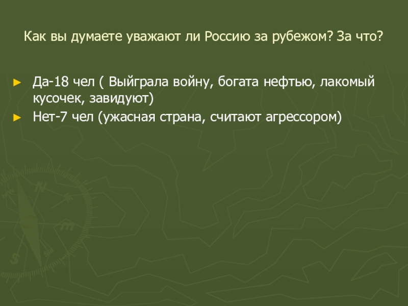 Слайд 16Как вы думаете уважают ли Россию за рубежом? За что?