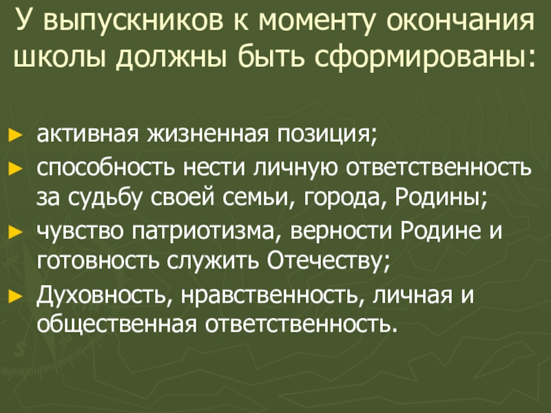 Слайд 11У выпускников к моменту окончания школы должны быть сформированы: