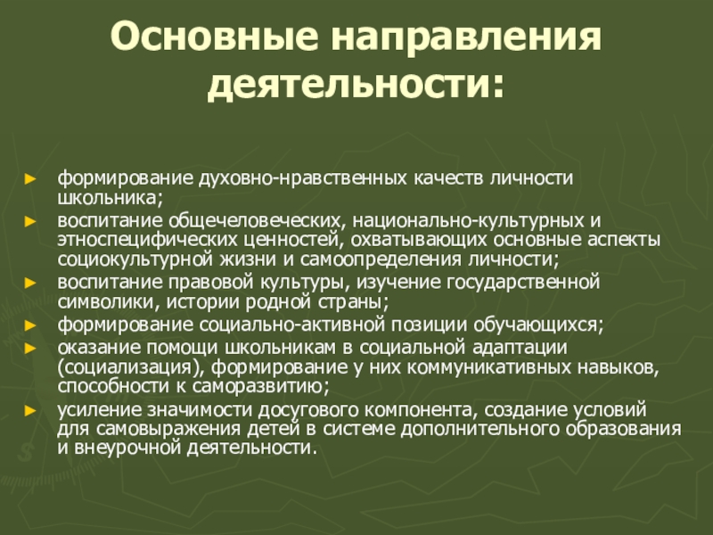 оказание помощи школьникам в социальной адаптации (социализация), формирование у них коммуникативных навыков, способности к саморазвитию;