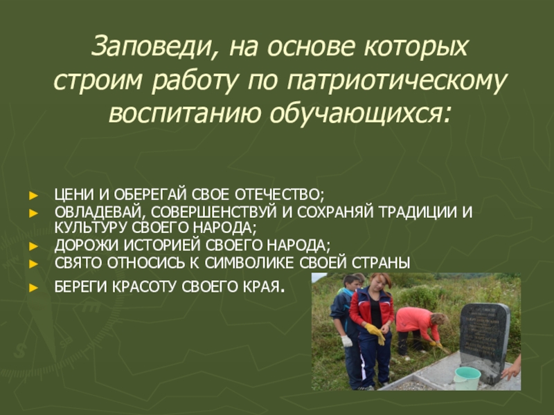 Слайд 8Заповеди, на основе которых строим работу по патриотическому воспитанию обучающихся: