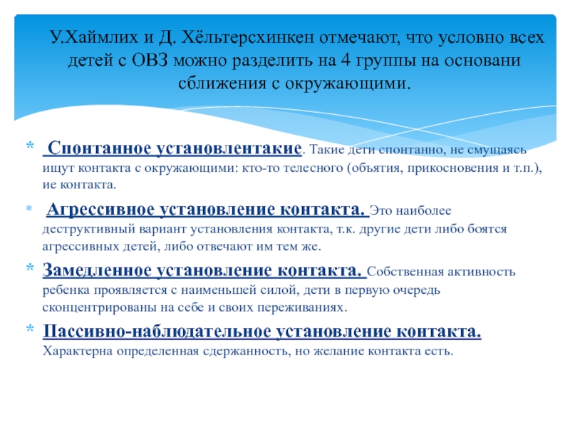 Спонтанное установлентакие. Такие дети спонтанно, не смущаясь ищут контакта с окружающими: кто-то телесного (объятия, прикосновения и т.п.), ие контакта.