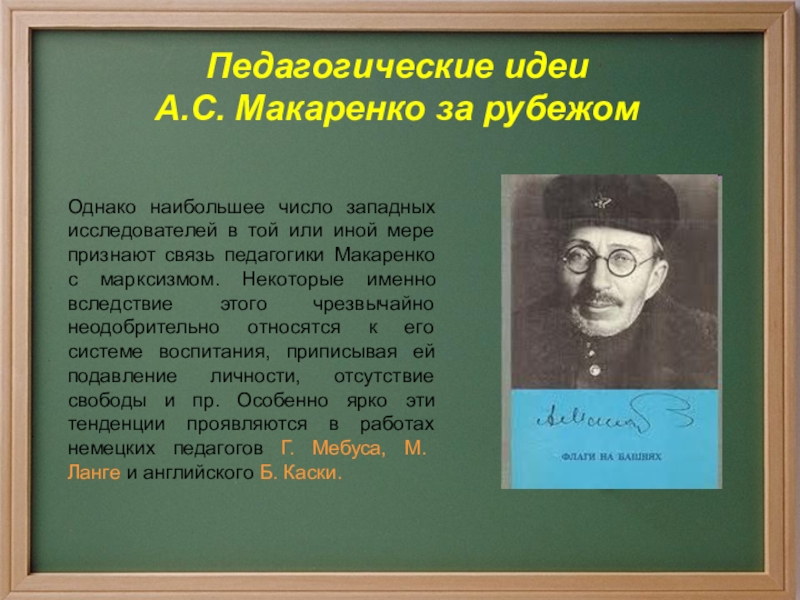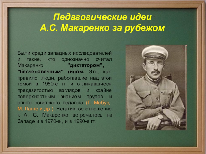 кто однозначно считал Макаренко "диктатором", "бесчеловечным" типом. Это, как правило, люди, работавшие над этой темой в 1950-е гг. и отличавшиеся предвзятостью взглядов и крайне поверхностным знанием трудов и опыта советского педагога (Г. Мебус, М. Ланге и др.). Негативное отношение к А. С. Макаренко встречалось на Западе и в 1970-е , и в 1990-е гг.
