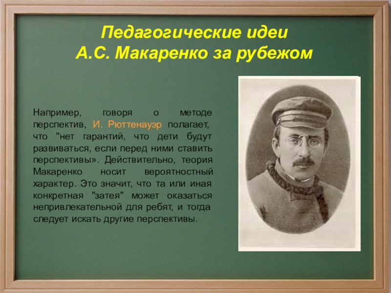 Рюттенауэр полагает, что "нет гарантий, что дети будут развиваться, если перед ними ставить перспективы». Действительно, теория Макаренко носит вероятностный характер. Это значит, что та или иная конкретная "затея" может оказаться непривлекательной для ребят, и тогда следует искать другие перспективы.