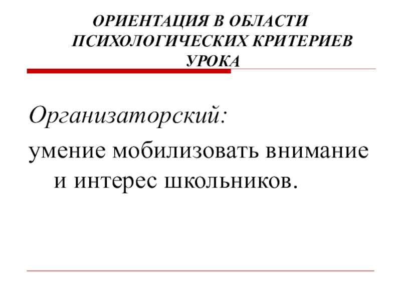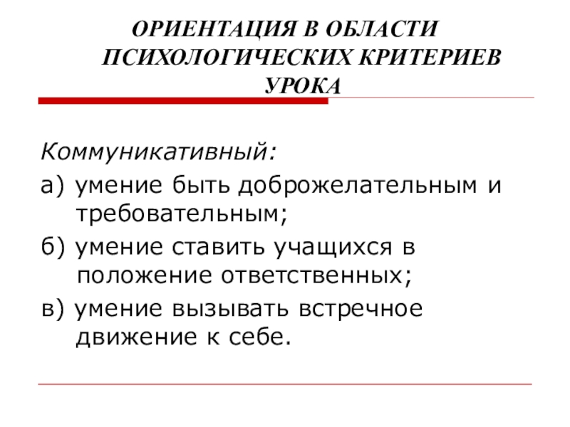 Слайд 25ОРИЕНТАЦИЯ В ОБЛАСТИ ПСИХОЛОГИЧЕСКИХ КРИТЕРИЕВ УРОКА