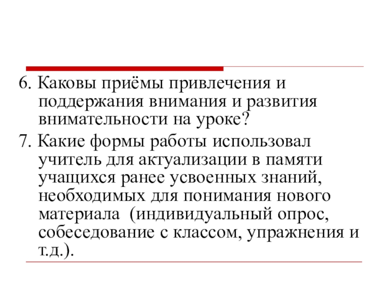 7. Какие формы работы использовал учитель для актуализации в памяти учащихся ранее усвоенных знаний, необходимых для понимания нового материала (индивидуальный опрос, собеседование с классом, упражнения и т.д.).