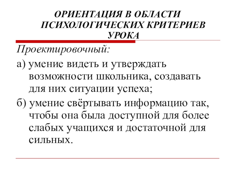 Слайд 23ОРИЕНТАЦИЯ В ОБЛАСТИ ПСИХОЛОГИЧЕСКИХ КРИТЕРИЕВ УРОКА