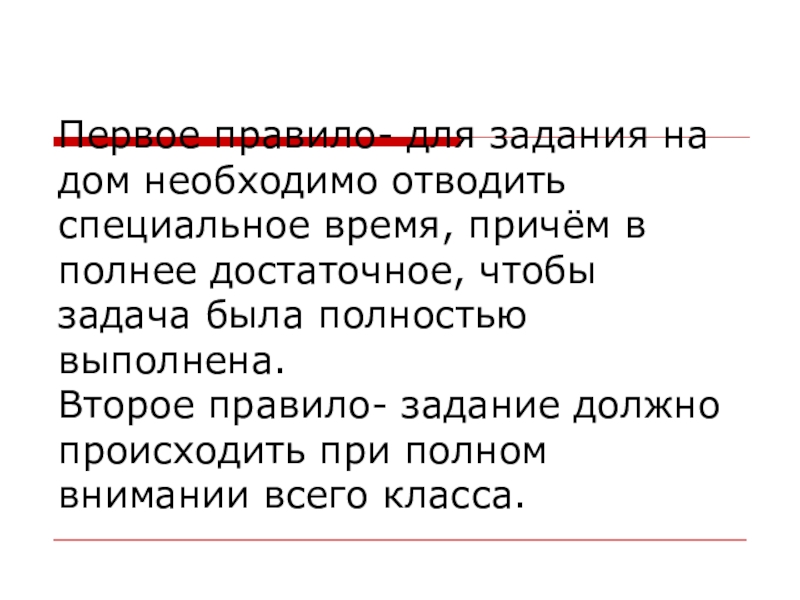 Слайд 8Первое правило- для задания на дом необходимо отводить специальное время, причём