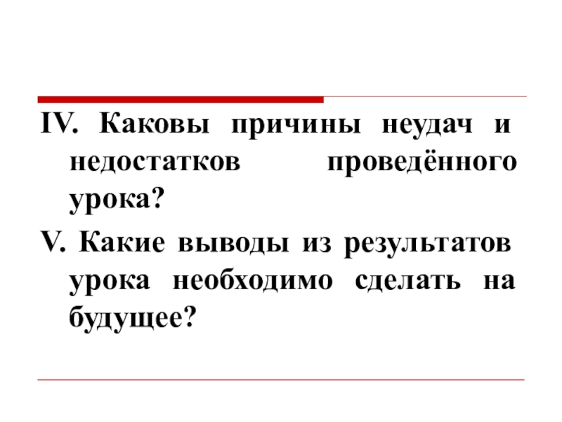 Слайд 12IV. Каковы причины неудач и недостатков проведённого урока?
