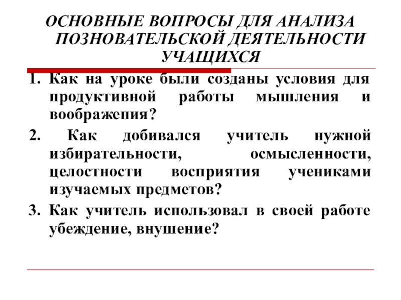 Слайд 13ОСНОВНЫЕ ВОПРОСЫ ДЛЯ АНАЛИЗА ПОЗНОВАТЕЛЬСКОЙ ДЕЯТЕЛЬНОСТИ УЧАЩИХСЯ