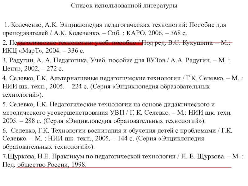 1. Колеченко, А.К. Энциклопедия педагогических технологий: Пособие для
