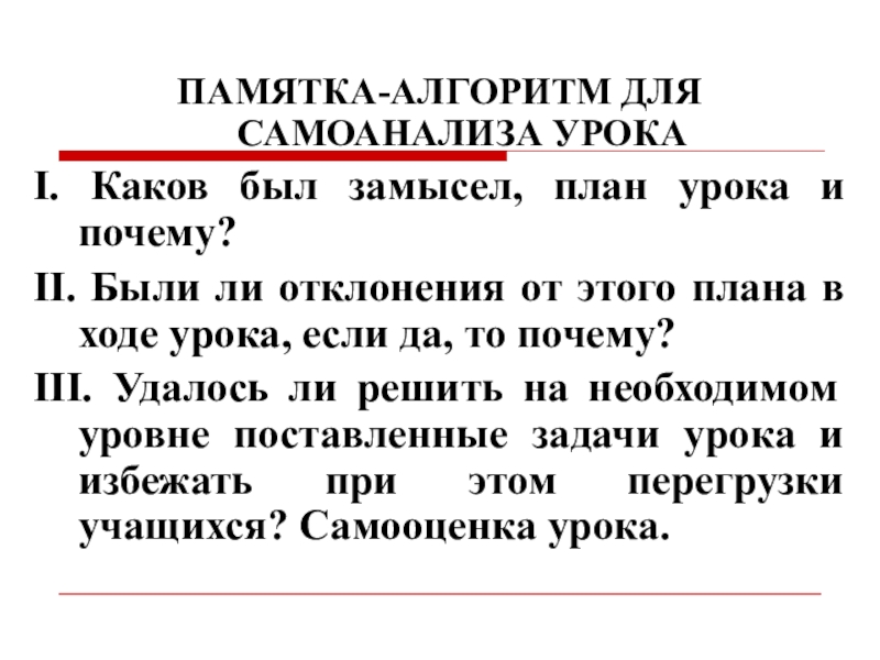 Слайд 11ПАМЯТКА-АЛГОРИТМ ДЛЯ САМОАНАЛИЗА УРОКА