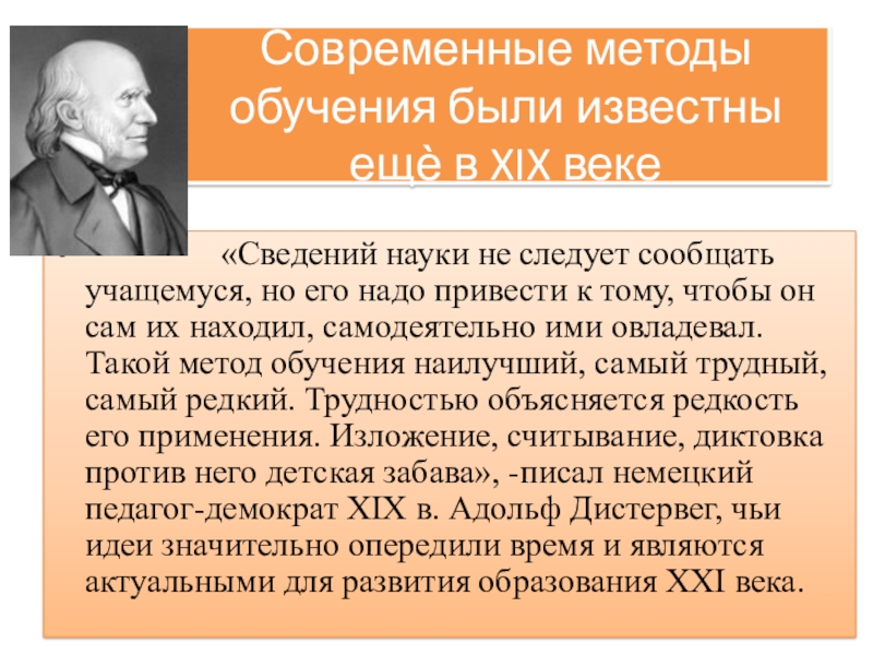 «Сведений науки не следует сообщать учащемуся, но его надо привести к тому, чтобы он сам их находил, самодеятельно ими овладевал. Такой метод обучения наилучший, самый трудный, самый редкий. Трудностью объясняется редкость его применения. Изложение, считывание, диктовка против него детская забава», -писал немецкий педагог-демократ XIX в. Адольф Дистервег, чьи идеи значительно опередили время и являются актуальными для развития образования XXI века.
