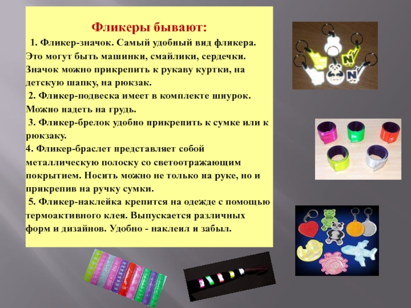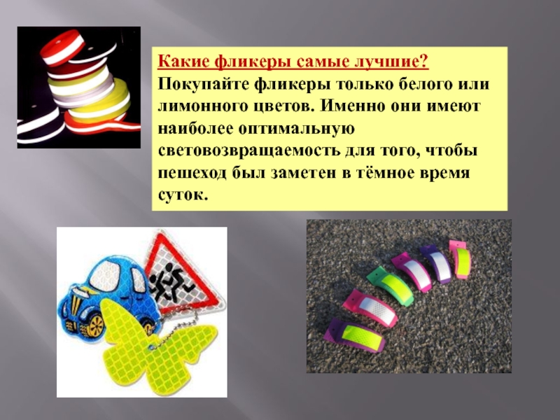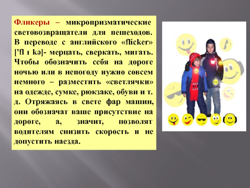 Слайд 8Фликеры – микропризматические световозвращатели для пешеходов. В переводе с английского «flicker»