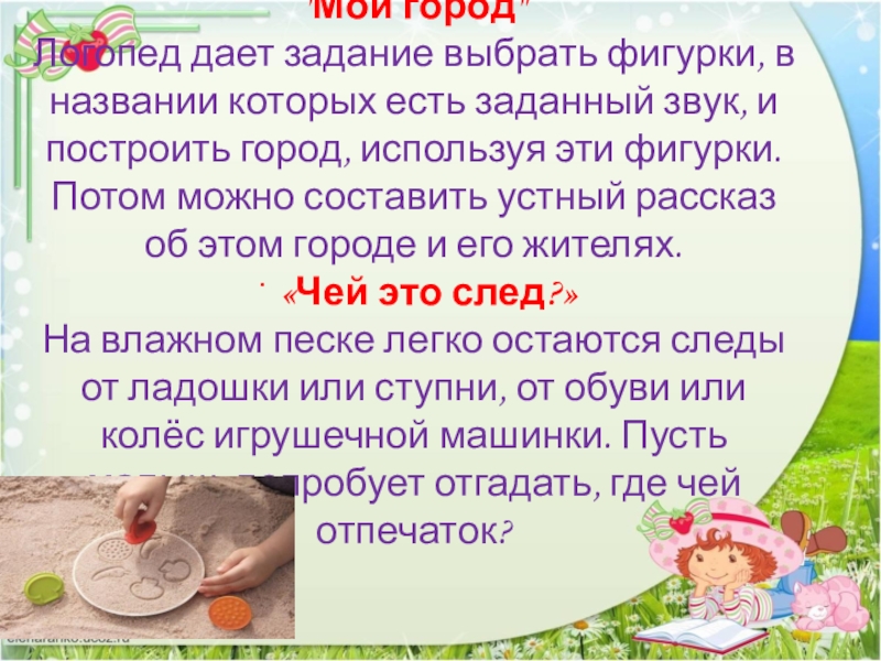 звук, и построить город, используя эти фигурки. Потом можно составить устный рассказ об этом городе и его жителях.
