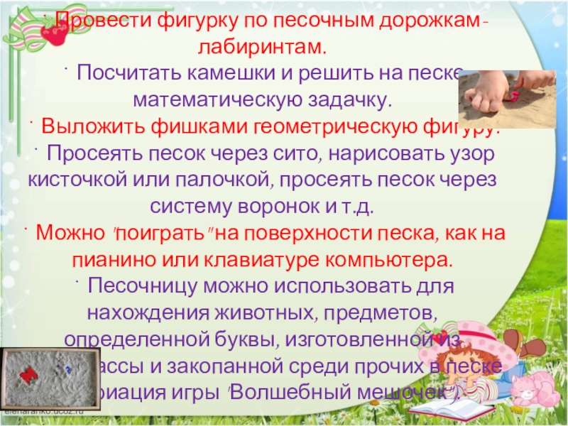 · Песочницу можно использовать для нахождения животных, предметов, определенной буквы, изготовленной из пластмассы и закопанной среди прочих в песке