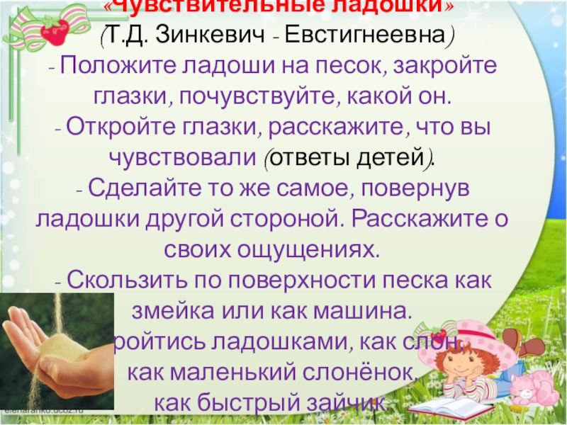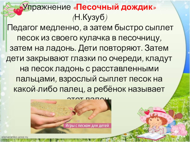 кулачка в песочницу, затем на ладонь. Дети повторяют. Затем дети закрывают глазки по очереди, кладут на песок ладонь с расставленными пальцами, взрослый сыплет песок на какой-либо палец, а ребёнок называет этот палец.