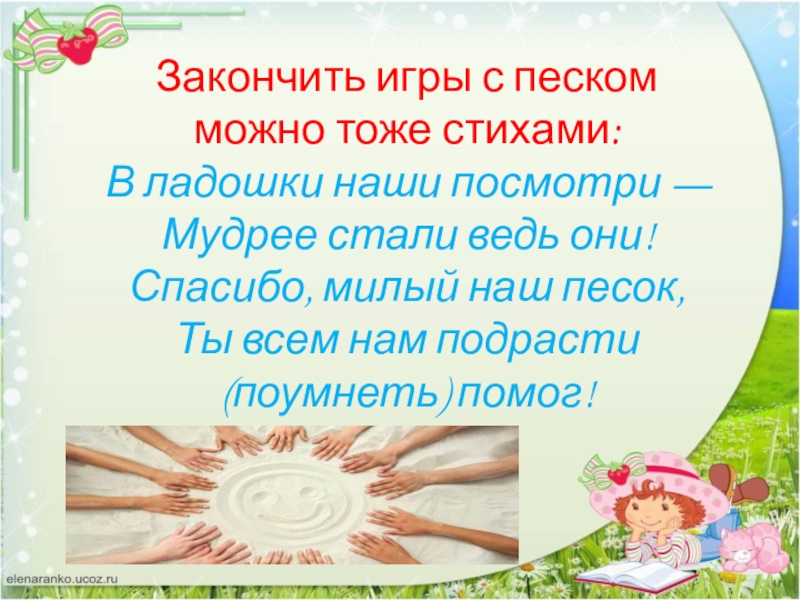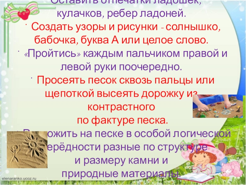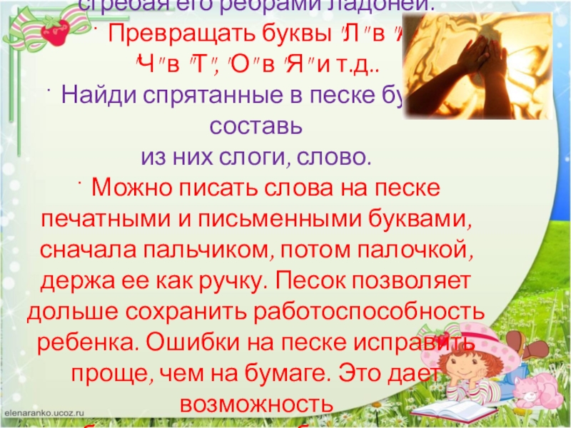 · Можно писать слова на песке печатными и письменными буквами, сначала пальчиком, потом палочкой, держа ее как ручку. Песок позволяет дольше сохранить работоспособность ребенка. Ошибки на песке исправить проще, чем на бумаге. Это дает возможность