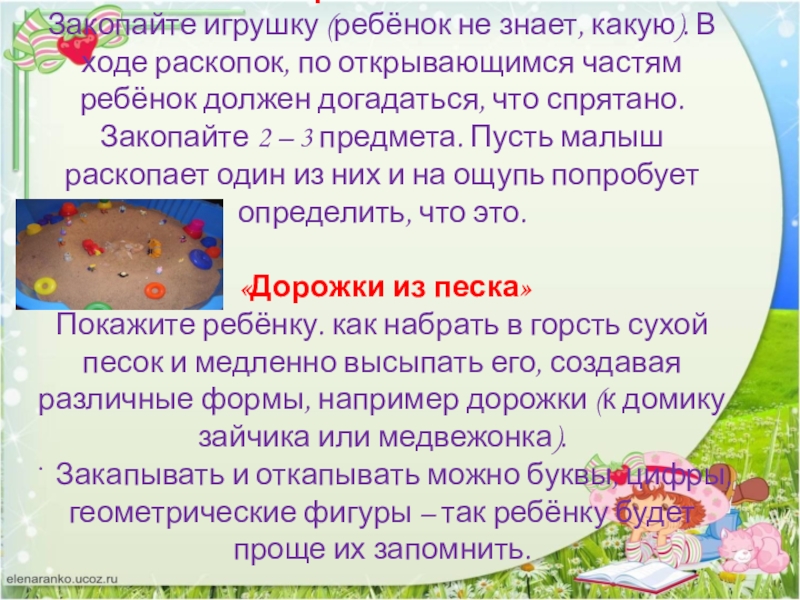 частям ребёнок должен догадаться, что спрятано. Закопайте 2 – 3 предмета. Пусть малыш раскопает один из них и на ощупь попробует определить, что это.