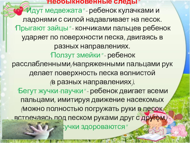 "Бегут жучки-паучки" - ребенок двигает всеми пальцами, имитируя движение насекомых (можно полностью погружать руки в песок, встречаясь под песком руками друг с другом) - "жучки здороваются"