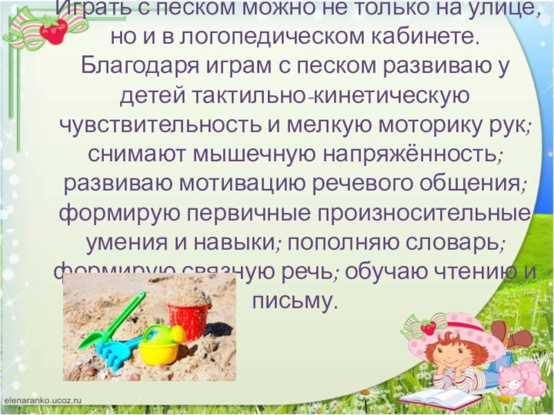 логопедическом кабинете. Благодаря играм с песком развиваю у детей тактильно-кинетическую чувствительность и мелкую моторику рук; снимают мышечную напряжённость; развиваю мотивацию речевого общения; формирую первичные произносительные умения и навыки; пополняю словарь; формирую связную речь; обучаю чтению и письму.
