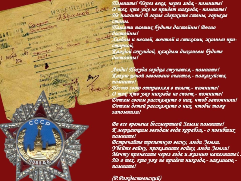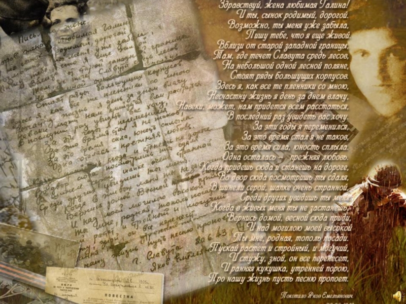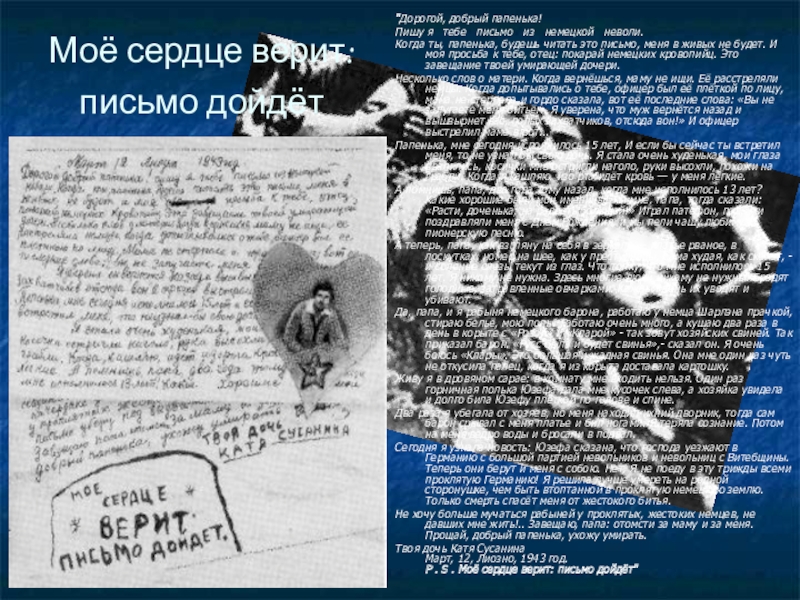 Когда ты, папенька, будешь читать это письмо, меня в живых не будет. И моя просьба к тебе, отец: покарай немецких кровопийц. Это завещание твоей умирающей дочери.