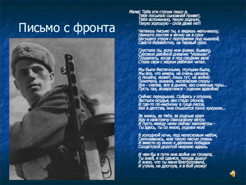 А помнишь, папа, два года тому назад, когда мне исполнилось 13 лет? Какие хорошие были мои именины! Ты мне, папа, тогда сказали: «Расти, доченька, на радость большой!» Играл патефон, подруги поздравляли меня с Днём Рождения, и мы пели чашу любимую пионерскую песню.
