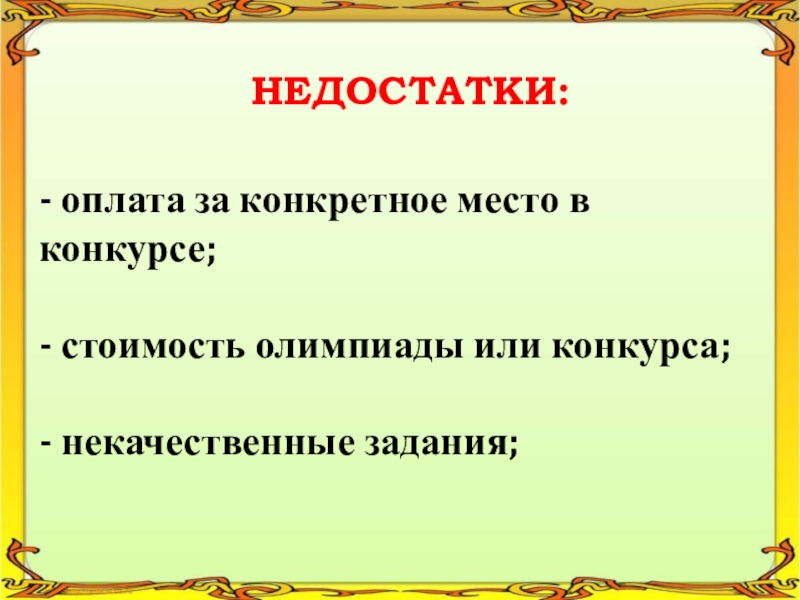 - оплата за конкретное место в конкурсе;  - стоимость олимпиады или конкурса;  - некачественные