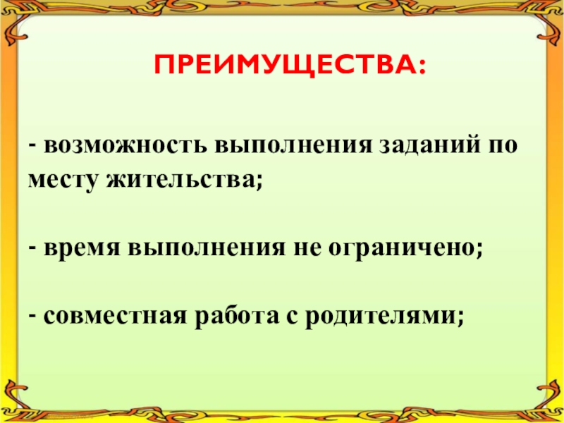 - возможность выполнения заданий по месту жительства; - время выполнения не ограничено; - совместная работа с родителями; ПРЕИМУЩЕСТВА: